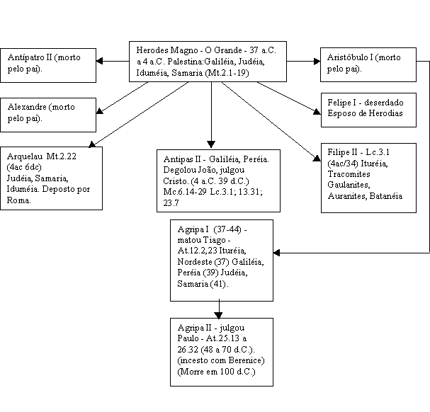 Apresentamos apenas parcialmente a dinastia herodiana porque nos limitamos aos nomes mais próximos aos fatos do Novo Testamento. Nosso maior interesse é apresentar a sucessão política na Palestina, principalmente na Judéia. Herodes Magno, também conhecido com Herodes, o Grande, governava a Judéia quando Jesus nasceu. Herodes teve 10 mulheres e 15 filhos, ou mais. Citamos 7 deles: Antípatro II, Aristóbulo I, Alexandre, Filipe I, Filipe II, Arquelau e Antipas II. Herodes matou seus filhos Alexandre, Aristóbulo I e Antípatro II. Deserdou Filipe I, que era casado com Herodias, a qual veio a adulterar com Antipas II (Mc.6.17). Após a morte de Herodes Magno, seu reino foi dividido entre três de seus filhos: Arquelau recebeu a Judéia, Samaria e Iduméia. Antipas II passou a governar a Galiléia e a Peréia. Filipe II recebeu os territórios do nordeste: Ituréia, Tracomites, Gaulanites, Auranites e Batanéia.